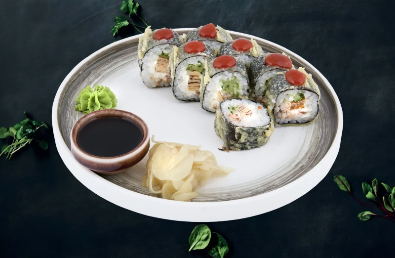 Мусс лосося, огурец, омлет, сыр творожный, соус шрирача.